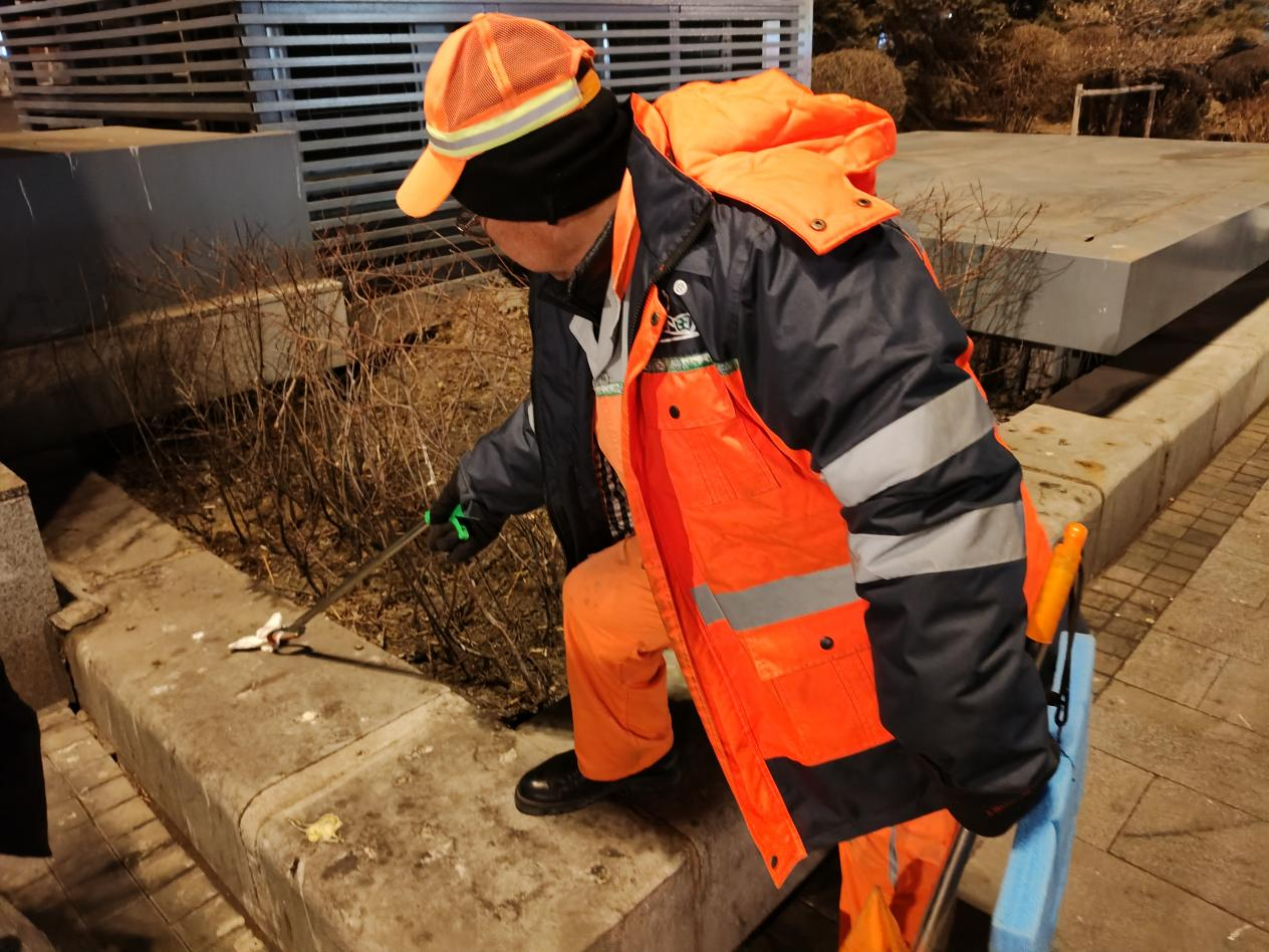 不久后,其他几名工友也陆续到岗。大家见面简单互道一声“过年好”,便迅速投入工作。李春雨告诉记者,除了广场路面,这片区域还有11个垃圾桶和29个烟灰缸,都要及时清理。