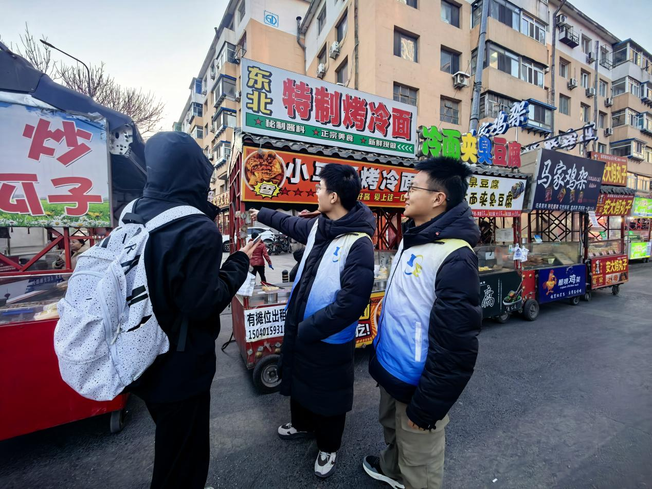 活动中,志愿者们身着统一马甲,在夜市游客服务中心集结。大家分工协作,有序服务,引导非机动车停放、劝导文明经营与有序就餐,向商户与游客普及消防安全、食品安全及反诈知识。青年学子发挥专业优势,协助维护现场秩序、提供咨询指引,用青春力量守护夜市烟火气。