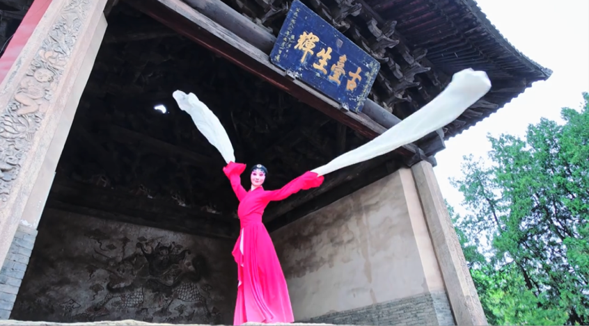 小梅花蒲剧团一级演员程雅琨在后土庙戏台上进行水袖表演