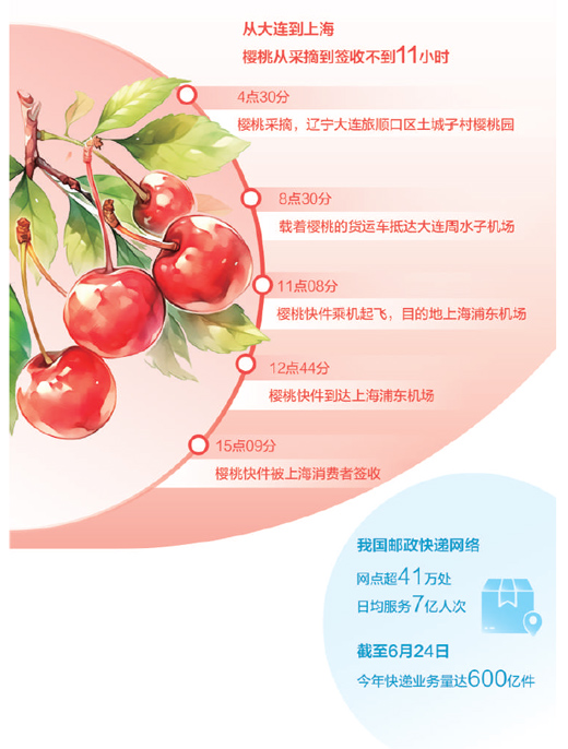 从大连采摘装车到上海派件送达,小小樱桃历经一场长途“接力跑”,仍是鲜活水灵。