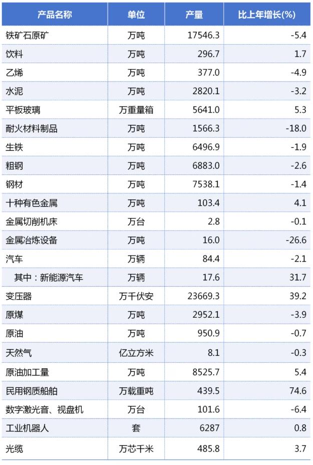 分行业看,全年规模以上工业中,装备制造业增加值比上年下降0.8%。其中,铁路、船舶、航空航天和其他运输设备制造业增长41.8%,电气机械和器材制造业增长2.2%,计算机、通信和其他电子设备制造业增长2.1%,汽车制造业下降4.3%,专用设备制造业下降9.5%。全年石化工业增加值比上年增长0.3%。其中,石油、煤炭及其他燃料加工业增长3.2%,化学原料和化学制品制造业下降6.8%。全年冶金工业增加值比上年增长8.3%。其中,黑色金属矿采选业增长14.1%,有色金属冶炼和压延加工业增长8.1%,黑色金属冶炼和压延加工业下降1.0%。全年农产品加工业增加值比上年下降0.8%。其中,农副食品加工业增长4.6%,烟草制品业增长1.1%,食品制造业下降8.9%。
