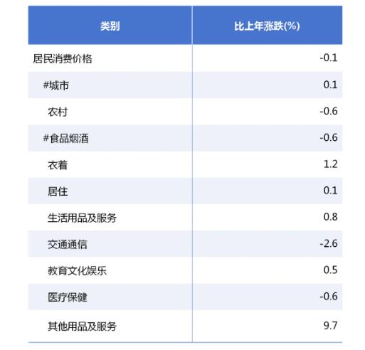 全年居民消费价格比上年下降0.1%。其中,城市价格上涨0.1%,农村价格下降0.6%。