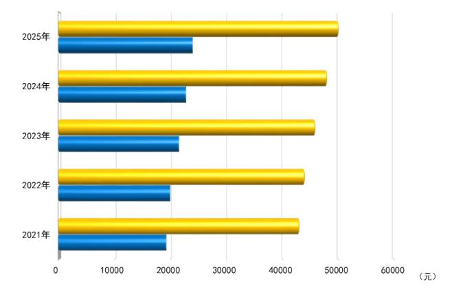 图5 2021-2025年城乡居民人均可支配收入