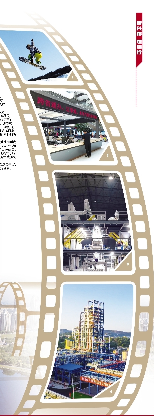 1.弓长岭冬季滑雪比赛中,参赛选手展示空中技巧。 庄奉明 摄 2. 辽阳市政务服务大厅。 本报记者 郑有胜 摄 3.辽宁镁鑫建筑材料科技有限公司首条生产线。 本报记者 许 刚 摄 4. 辽阳石化新建年产30万吨高性能聚丙烯项目。 王志强 摄