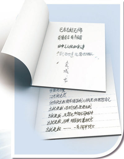 他曾摘抄过一首长诗,结尾几句这样写道:“这就是我,百折不挠虎虎生威/这就是我,无怨无悔龙马精神/这就是我,百炼成钢鹰击长空/这就是我——一名海军战士。”