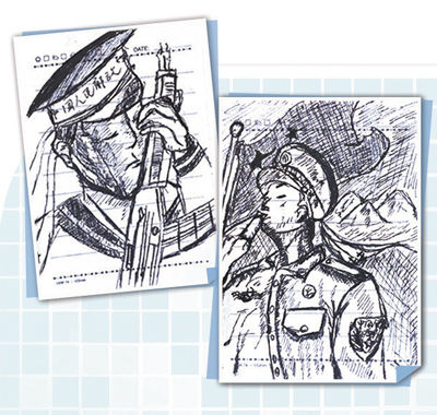 ↑金城龙绘制的军旅素描画。