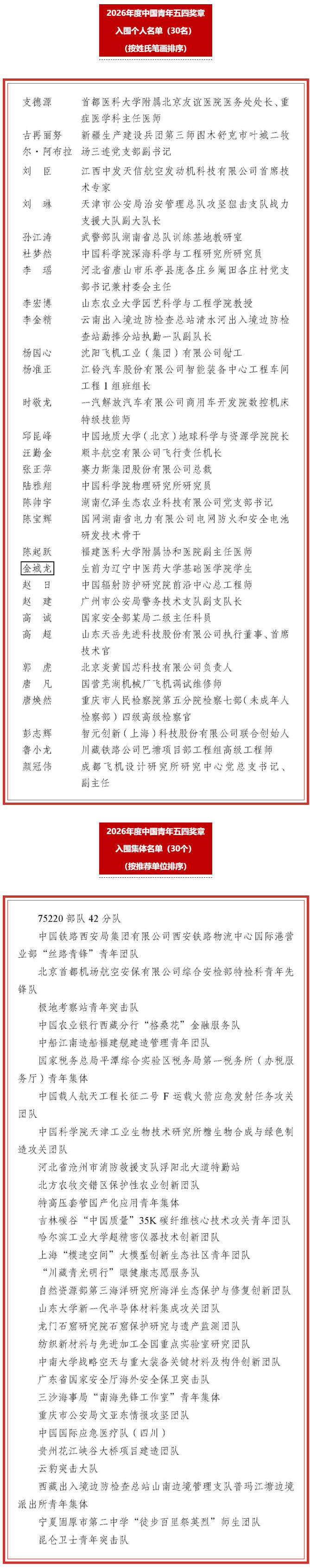 为进一步接受社会监督,现将2026年度中国青年五四奖章暨新时代青年先锋奖入围名单予以公示。公示期为2026年3月23日至27日,如对名单持有异议,请于2026年3月27日17:00前向评选表彰工作领导小组办公室实名反映。反映形式为电话、信函、电子邮件,信函以到达日邮戳为准。