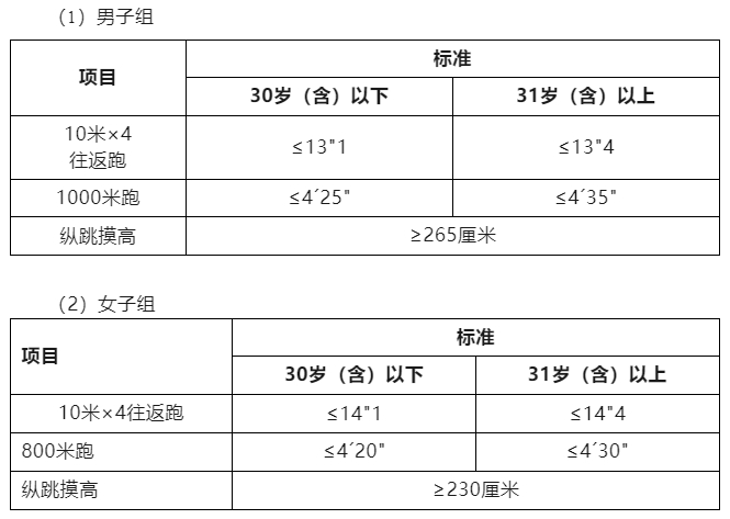 2.体能测试内容:体能测试标准参照《公安机关录用人民警察体能测评项目和标准》执行。