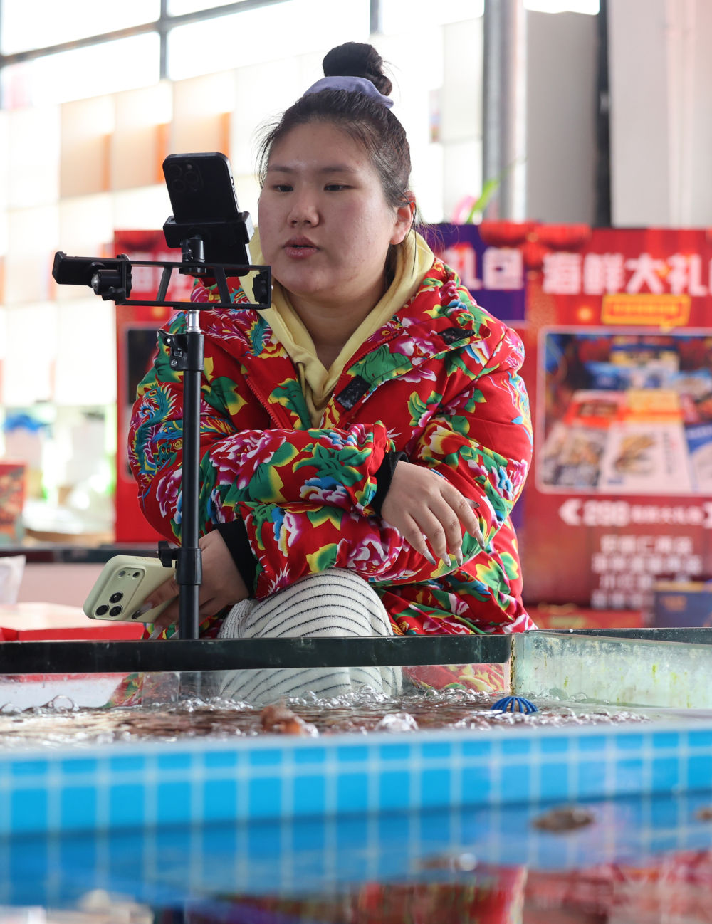 ↑2月5日,在东北新发地农产品供应链中心,海鲜店铺的工作人员在电商平台上介绍自家的海鲜。 新华社记者 韩赫 摄