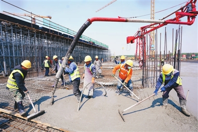 4月28日,工人们顺利完成速滑馆1600号桩的浇筑任务。 李浩摄