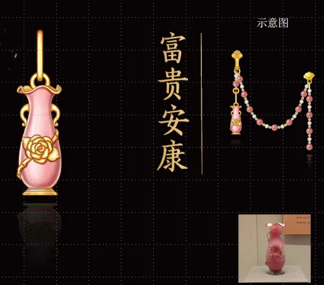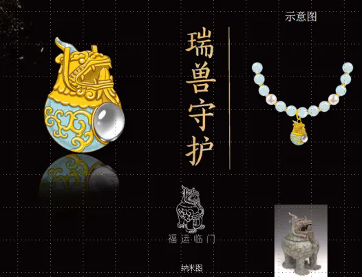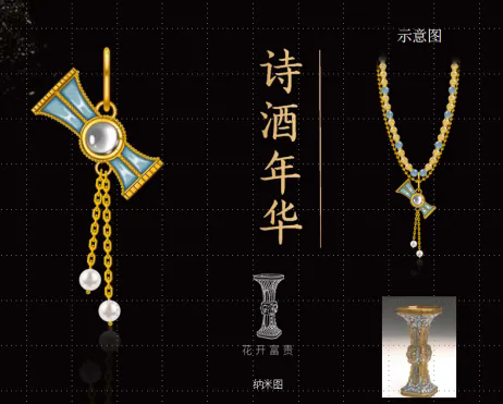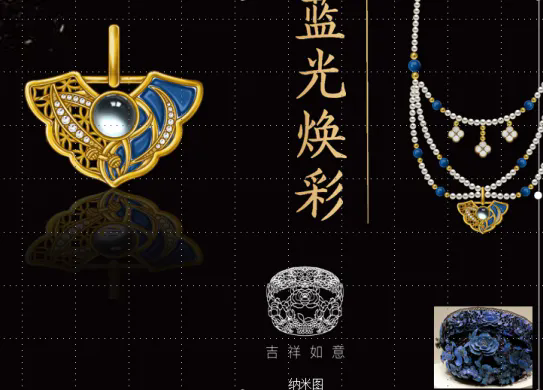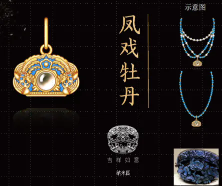 亮点:镀金珐琅配饰中,嵌入微米投影石,可裸眼观赏文物图案。
