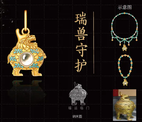 巧思细节:立体造型还原甪端昂首挺胸的威仪,胸前贝珠与珐琅彩交相辉映,搭配微米珠投影,让祥瑞之气随步履生姿。