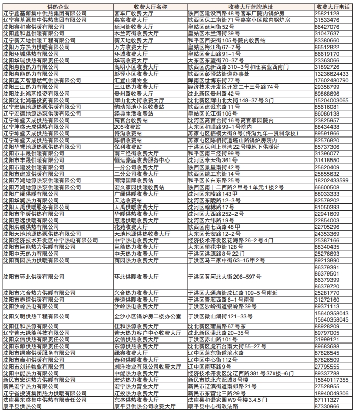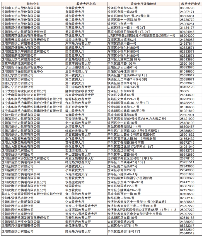 还有不足20天沈阳就开始供热了,您家的采暖费缴纳了吗?您是否还在为采暖费如何缴、去哪缴而烦恼?10月11日,沈阳市房产局公布了沈阳市113个供热缴费大厅地址和电话,无论是供热缴费咨询还是缴费中遇到的难题,均可拨打公开服务电话进行询问。