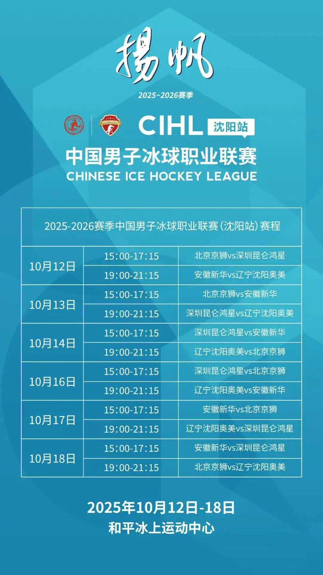 本赛季联赛汇聚了北京京狮、安徽新华、辽宁沈阳奥美、深圳昆仑鸿星四支国内职业冰球俱乐部,沈阳站赛事将在6个比赛日内进行12场角逐。