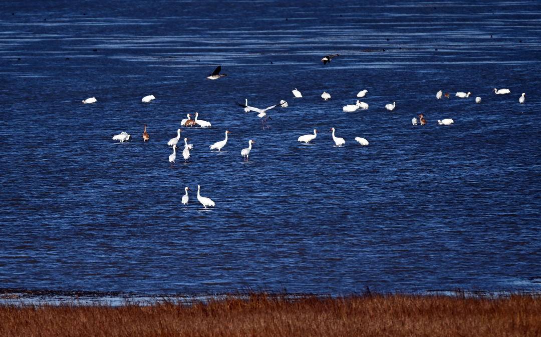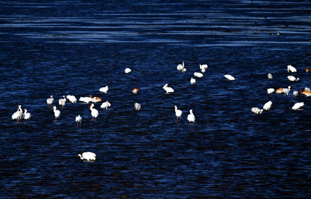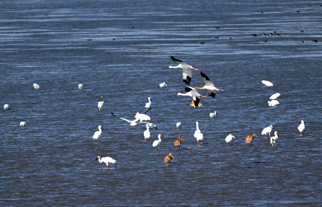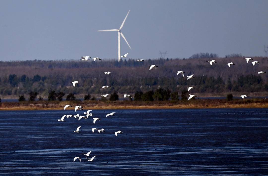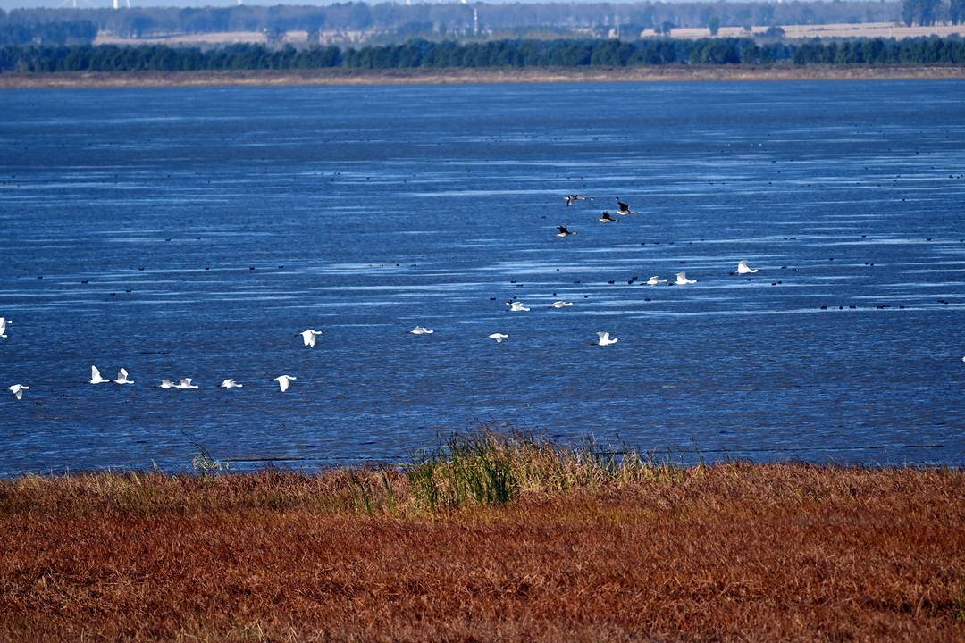 10月19日,辽宁沈阳康平县卧龙湖生态区迎来了大批南迁候鸟。东方白鹳、白鹤、天鹅、大雁等候鸟齐聚于此,在波光粼粼的湖面上自由地歇息、觅食、飞翔,为秋日的卧龙湖勾勒出一幅幅美轮美奂的生态画卷。