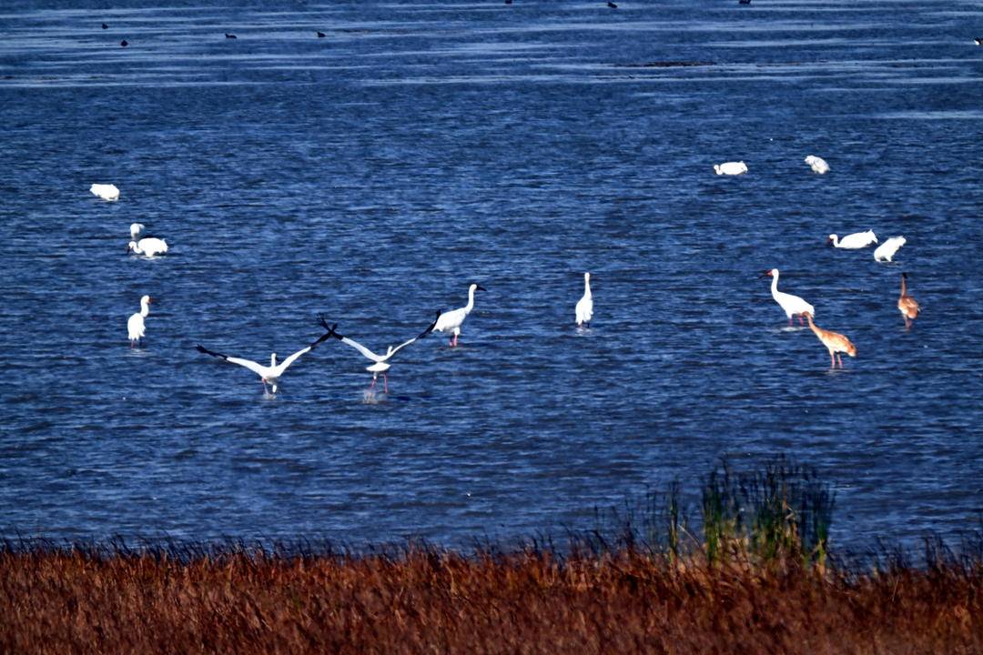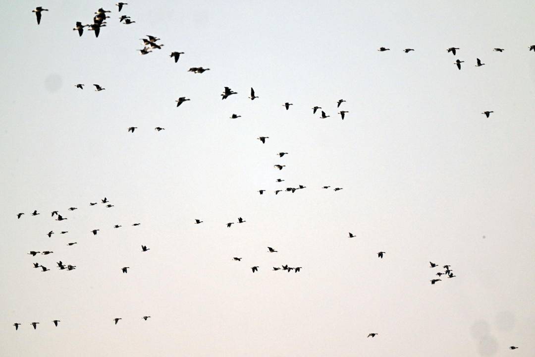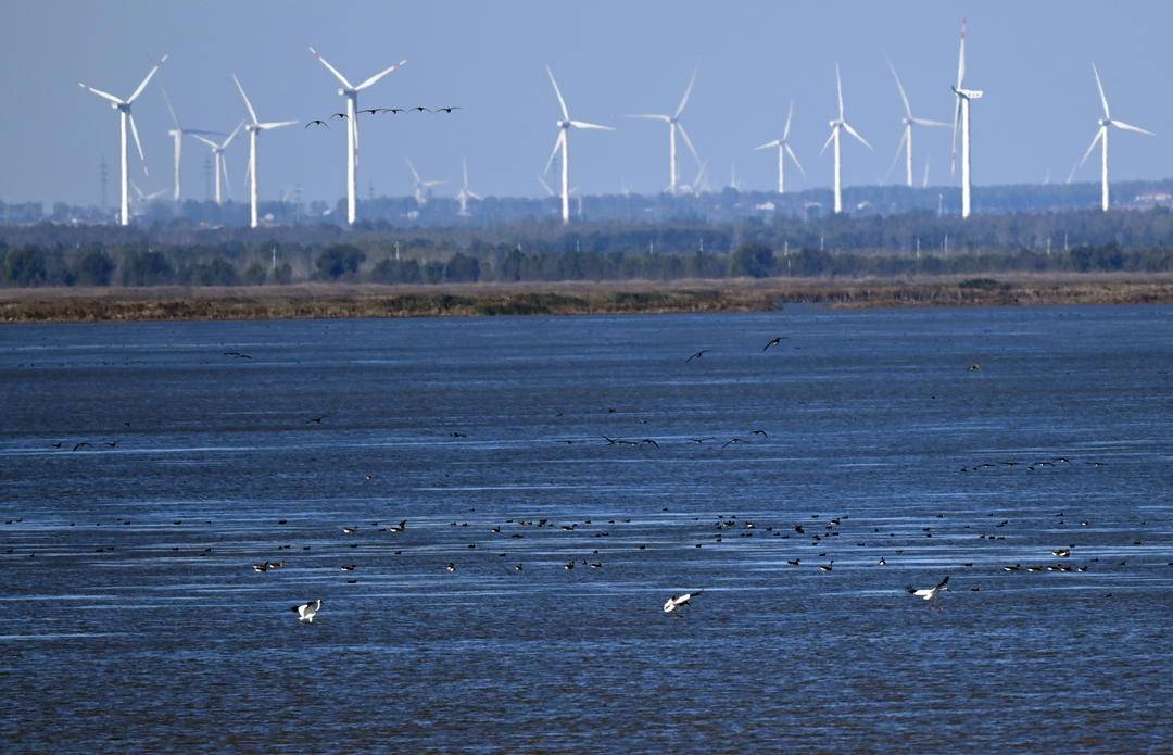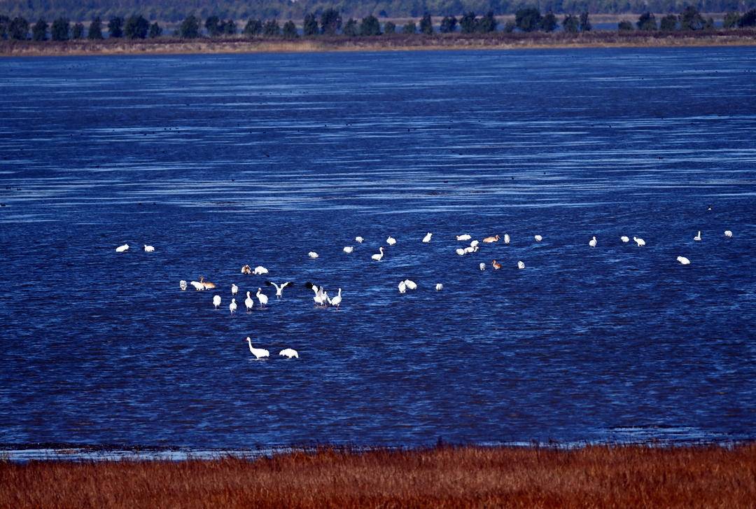 10月19日,辽宁沈阳康平县卧龙湖生态区迎来了大批南迁候鸟。东方白鹳、白鹤、天鹅、大雁等候鸟齐聚于此,在波光粼粼的湖面上自由地歇息、觅食、飞翔,为秋日的卧龙湖勾勒出一幅幅美轮美奂的生态画卷。
