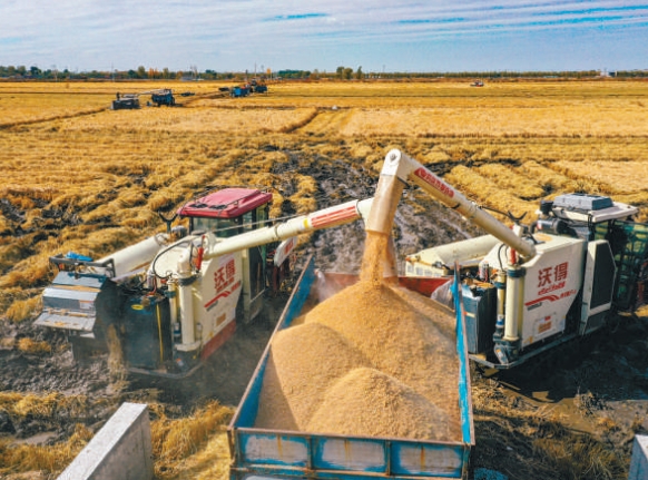 收割机在稻田里穿梭,收割、脱粒、装车,一气呵成。王雁摄