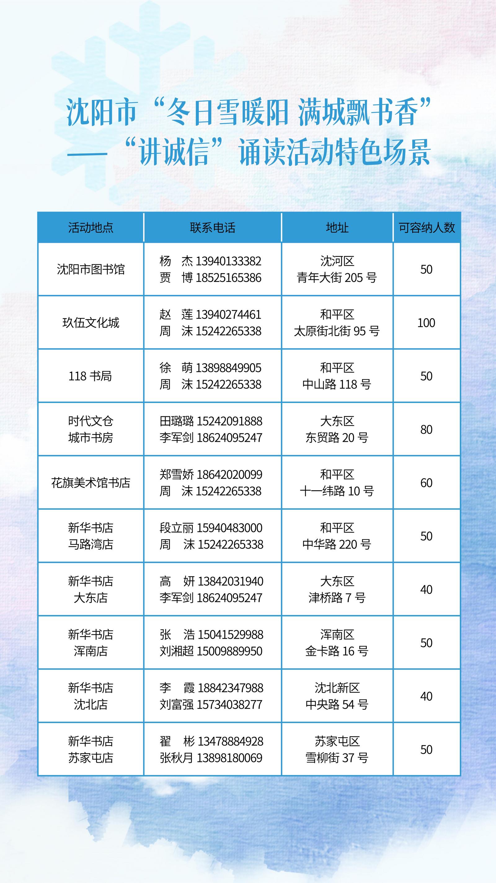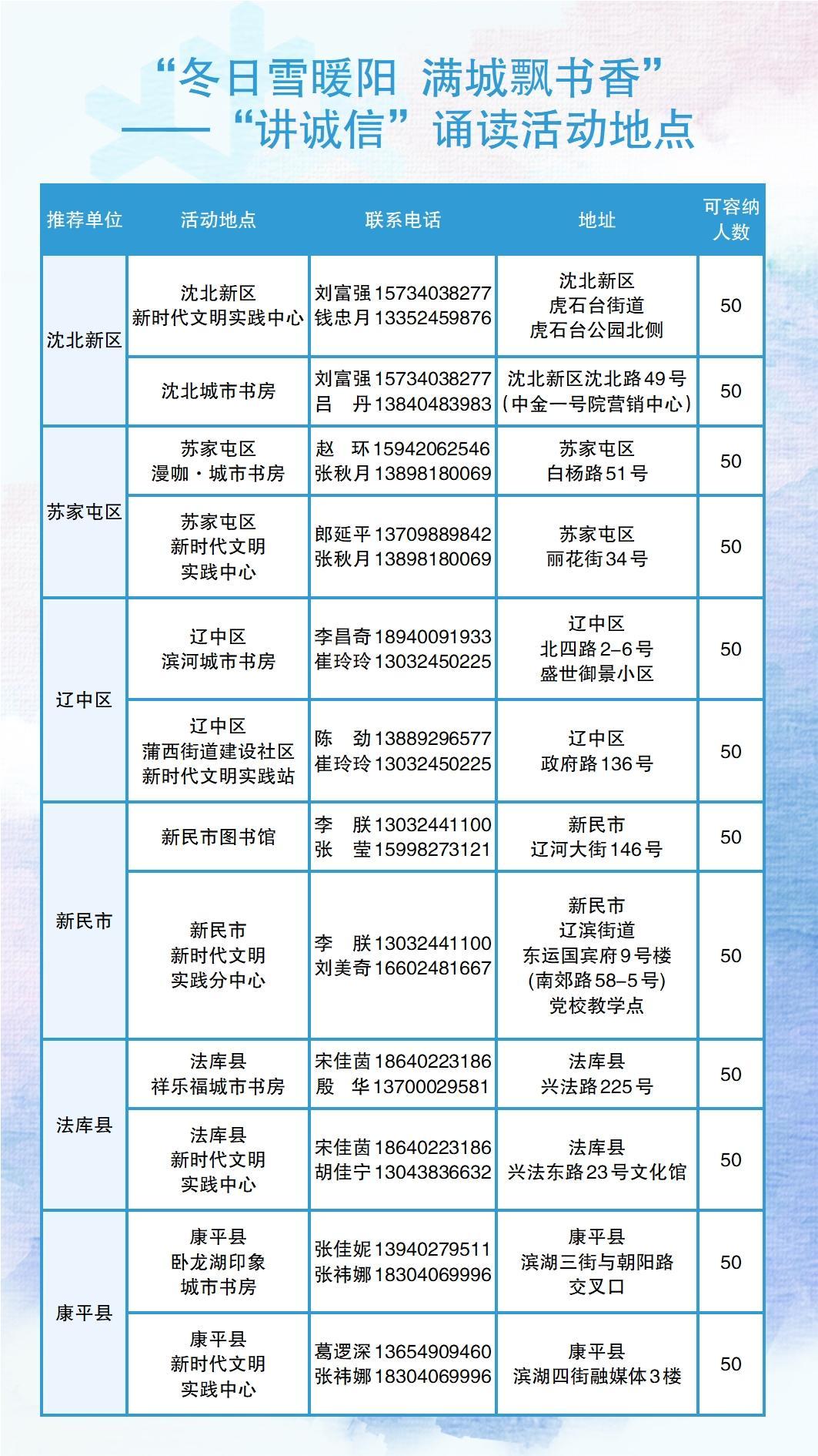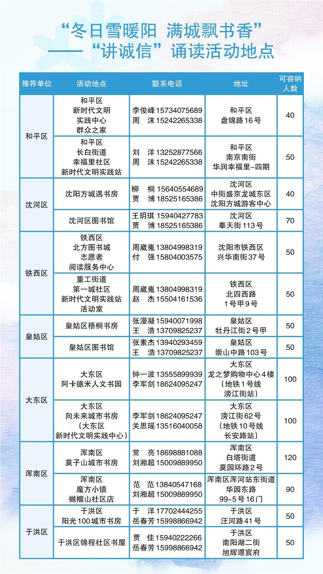 12月的每周三,沈阳发布客户端将会发布当周周末各诵读场所开展“冬日雪暖阳 满城飘书香”——“讲诚信”诵读活动分享会的具体时间,敬请关注。