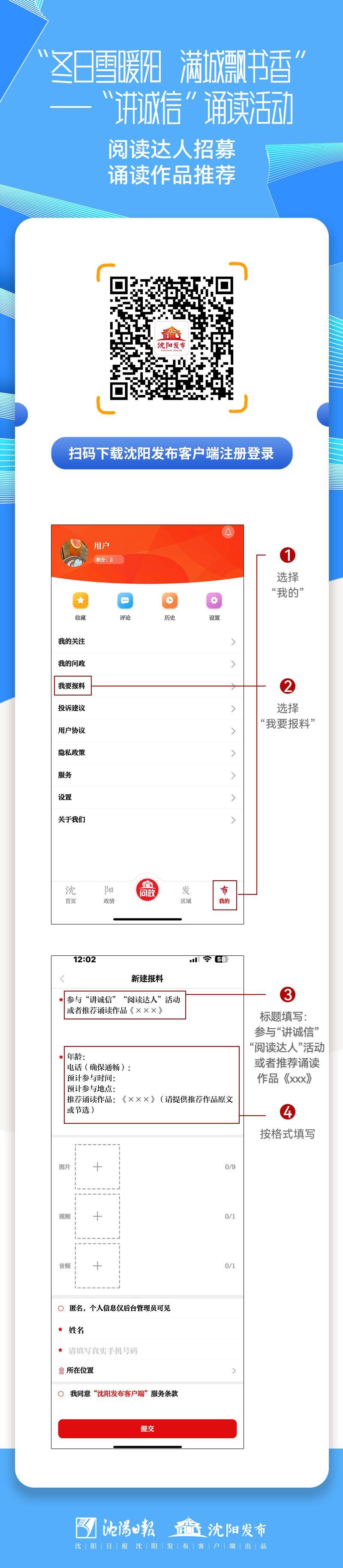 下载沈阳发布客户端→预约诵读时间、地点、场次→报名时请记得留下有效联系电话,以便工作人员确认相关信息与诵读作品等。