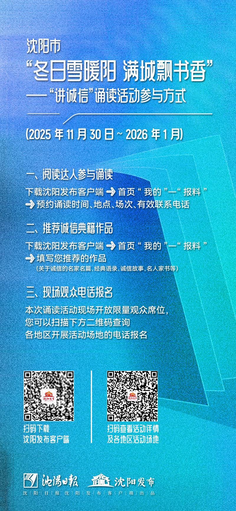 新闻媒体将对相关场次的诵读活动充分报道,全面展示诵读人风采。2026年1月中旬,沈阳市“冬日雪暖阳 满城飘书香”——“讲诚信”诵读活动分享会将在沈阳广播电视台举办,邀请在全市诵读活动中表现突出的代表进行现场诵读展示分享,并颁发“阅读达人”和“诚信宣传员”证书。