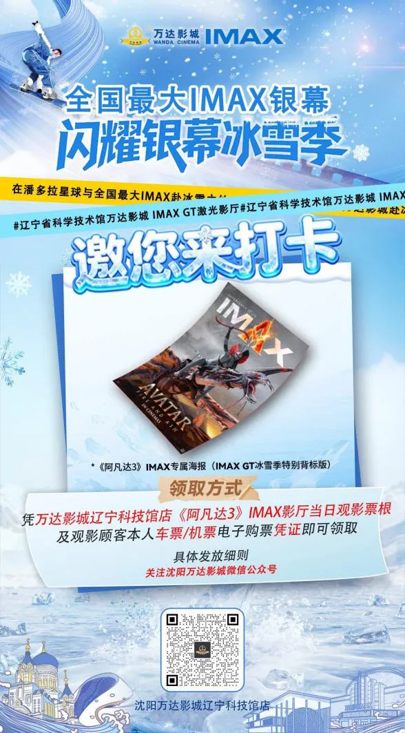 其中外地游客占比近四成,西藏、海南等地的影迷都曾专程奔赴此处观影。此次冰雪季,影厅进一步深化文旅联动,特别定制沈阳文旅版IMAX联合海报。