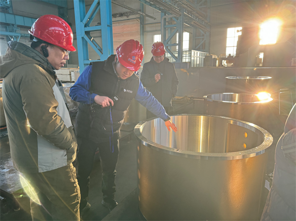 工作人员(左二)介绍沈冶重型装备生产车间内的设备