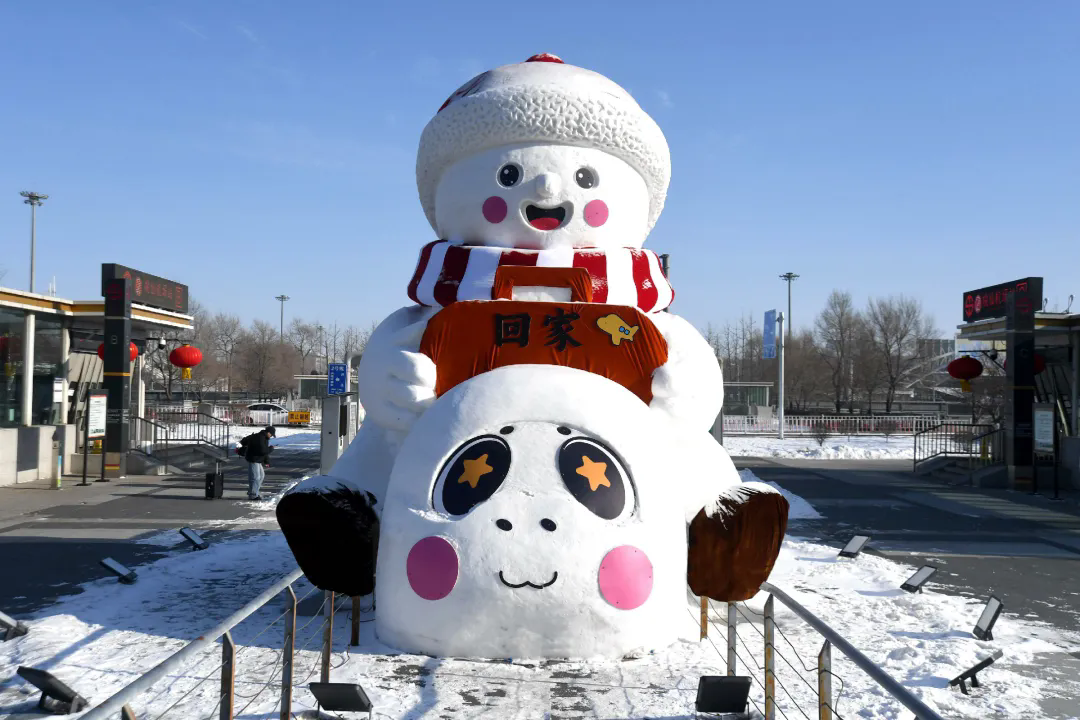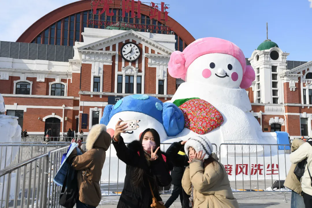 沈阳站前的搓澡大雪人自带烟火气,憨态可掬。桃仙机场二层落客平台,一家四口的大雪人定格团圆暖意;机场地铁站附近的大雪人,则静静等候着远方来客,道一声“沈阳欢迎你”。