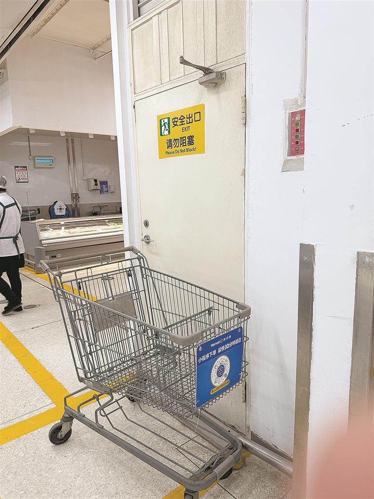 ◀华南国际商城沃尔玛超市内,安全出口门前购物车、购物篮随意摆放,未及时清理。大连新闻传媒集团 记者杜迈 摄