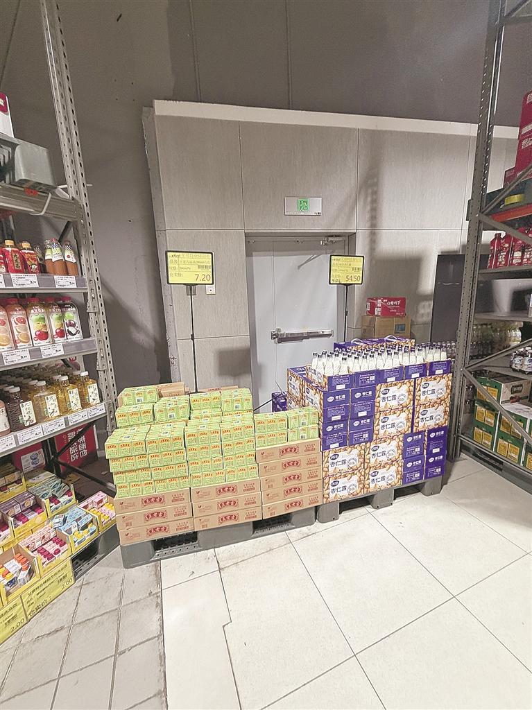 ▲佳兆业广场负一层爱易特仓储超市,不仅多处安全出口被堆放的商品遮挡得严严实实,防火卷帘门下也堆满货物。大连新闻传媒集团记者杜迈 摄