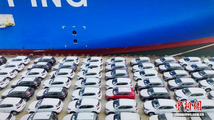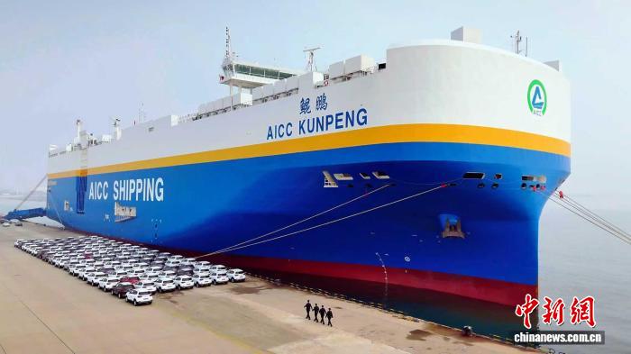 “鲲鹏”轮靠泊码头,2040辆新能源汽车依次驶上甲板。郝宏伟 摄