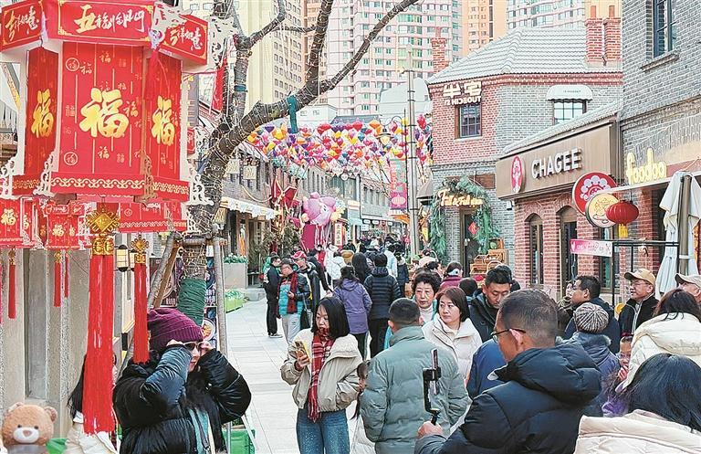春节期间,东关街挂满红灯笼与福字,街区内游人如织。大连新闻传媒集团/大连云记者张瑜 摄