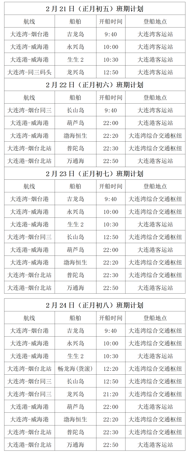 受大风气象影响,2月21日12:50时起大连至烟台、威海航线出港班期全部停航,后续班期调整如下: