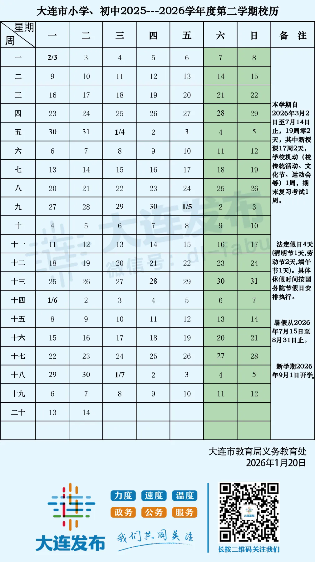 本学期自2026年3月2日起到2026年7月21日止,共计20周零2天。法定假日按国务院办公厅发布的节假日安排执行。高一高二期末考试原则上定于7月14、15日。