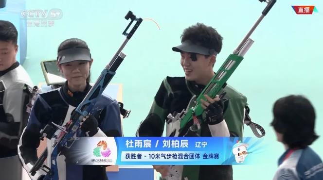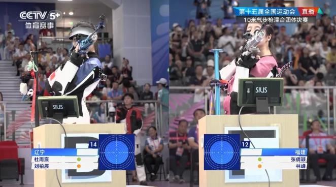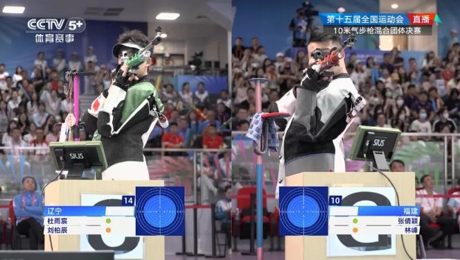 决赛阶段,辽宁一队杜雨宸、刘柏辰和福建一队张倩颖、林峰展开巅峰对决,辽宁一队以6比0开局,福建队紧追不舍,并在10比14的情况下挽救一个赛点,经过激烈争夺,辽宁一队以16比12击败对手摘得第十五届全国运动会射击比赛首金。