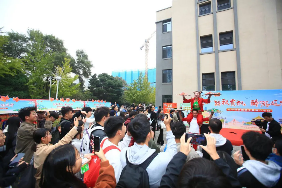 活动现场堪称一场沉浸式辽宁文化盛宴。省内非遗、文创等特色文旅花车集体亮相,成为移动的“辽宁文旅名片”;创意快闪表演巧妙融合唢呐的高亢、小提琴的悠扬与二人转的鲜活,传统韵味与现代风采碰撞出独特火花,引得学子纷纷驻足观赏、互动打卡。筷子投壶等趣味游戏点燃现场热情,免费发放的文旅大礼包与鸡架、中街冰点等辽宁特色美食,更让学子们在味蕾与惊喜中,真切触摸到辽宁的文化底蕴与宠客温度。