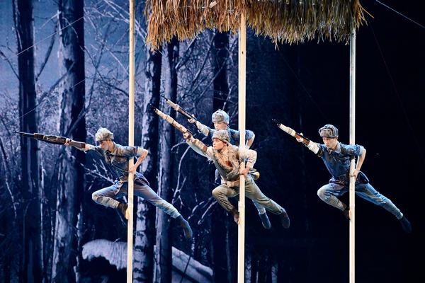 《先声》的突破性,首先在于打破传统杂技“重技轻叙”的桎梏,构建起“技艺为骨、叙事为魂”的全新艺术体系。剧中汇聚舞狮、高跷、腾空飞杠、爬杆、软钢丝、高椅、车技、钻圈等30余项经典杂技技艺,更量身定制《摩托飞车》《集体网吊》等创新表演,让每一项技巧都成为叙事的“语言”。“集体爬杆”的迅猛腾跃,复刻了战士们冲锋陷阵的壮烈;“高空网吊”的舒展之姿,隐喻着家园沦陷中信仰的坚守;“自行车跑背”的失衡与平衡,诠释着战火中不屈的坚韧;“摩托飞车”的街头穿梭,再现了殊死搏斗的激烈……这些充满张力的肢体语言,将历史的厚重与英雄的悲壮,转化为直观可感的艺术冲击,让观众在惊叹中读懂抗争的意义。科技的赋能,更让舞台叙事充满沉浸感。可自由转换的纱幕、全景式LED背景幕墙与电影蒙太奇手法交织,时而重现林海雪原的苍茫,时而铺展沈阳街景的烟火;爆破特效与杂技表演的精准配合,将战争的残酷与抗争的激烈具象化。北国冰雪、奉天火车站等地域元素的细腻呈现,让历史场景既具真实性,又富艺术张力,仿佛带观众穿越时空,回到那个风雨如晦的年代。