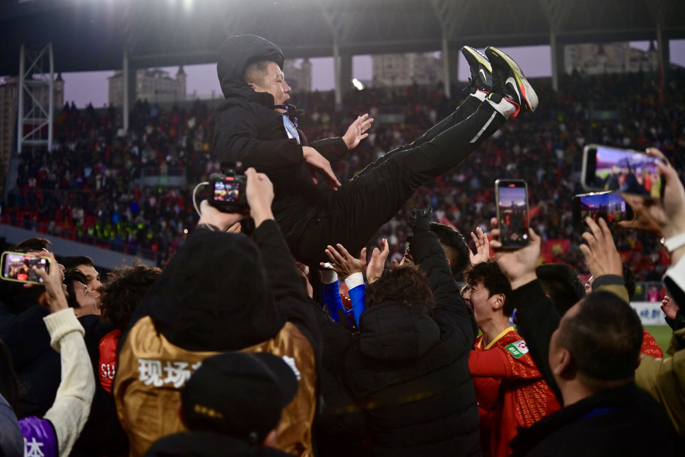 10月26日,辽宁铁人队主教练李金羽(上)在赛后被队员抛向空中庆祝。当日,在辽宁沈阳举行的2025赛季中国足球协会甲级联赛第28轮比赛中,辽宁铁人队1比0战胜南通支云队,提前锁定中甲联赛冠军,并实现冲超目标。新华社记者吴青昊 摄