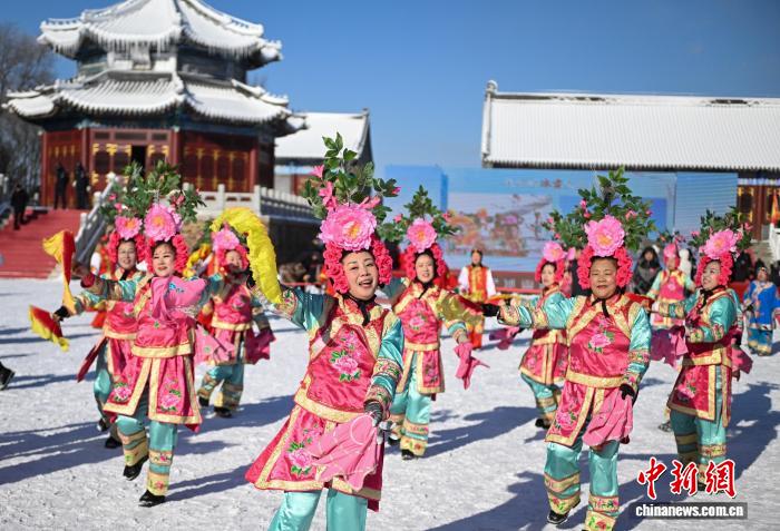 12月11日,在抚顺赫图阿拉城景区,人们在雪地上扭秧歌。中新社记者 于海洋 摄