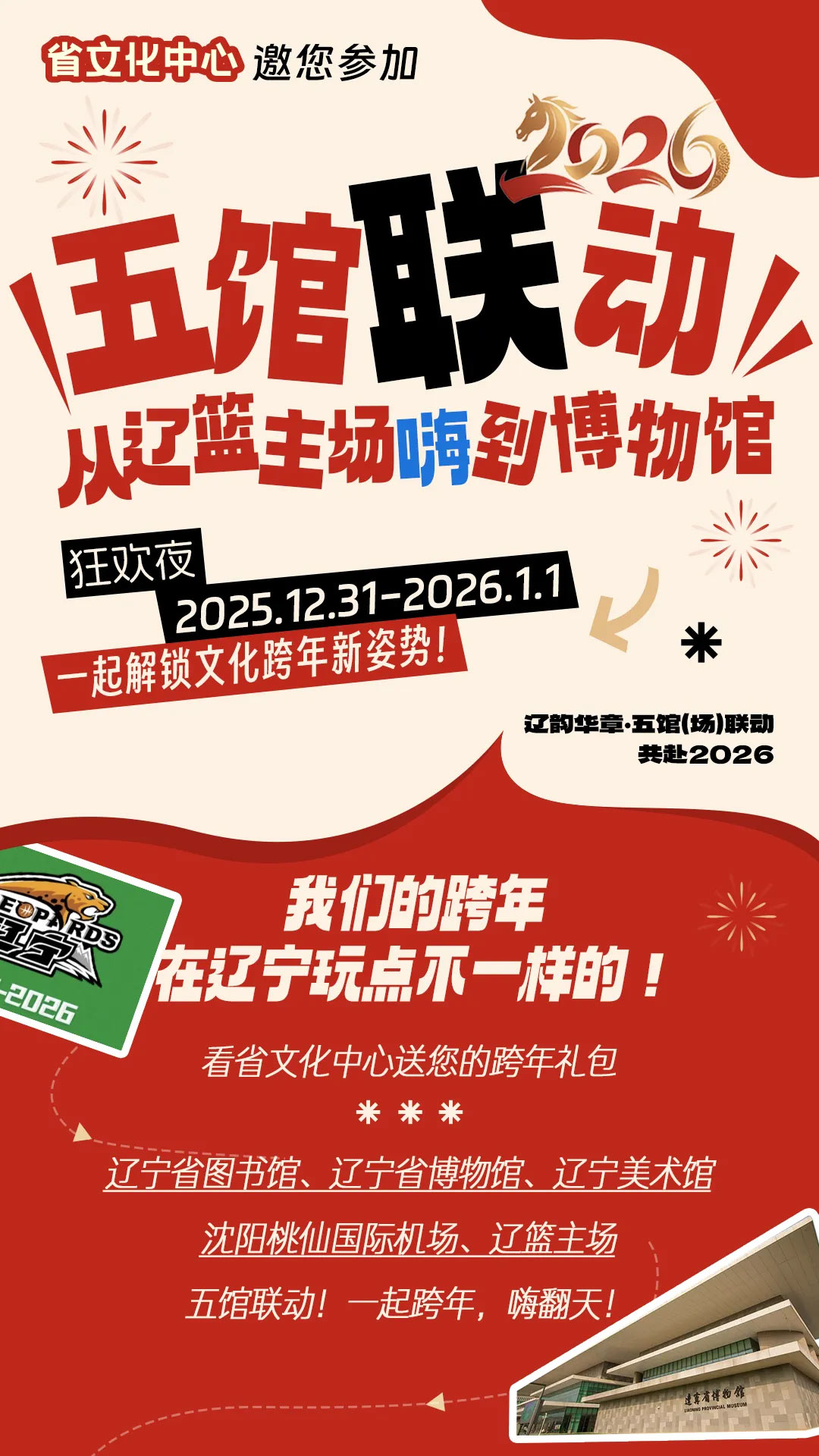 今年跨年夜,辽沈大地将迎来一场前所未有的文化盛事。以“文化传承、艺术创新、阅读迎新、体育激情”为主线,辽宁省博物馆、辽宁省图书馆、辽宁美术馆、辽篮主场和沈阳桃仙机场将首次打破场馆壁垒,联袂打造“辽韵华章 五馆(场)同庆 共赴2026”跨年文化活动。这场从2025年12月31日傍晚持续至2026年元旦午夜的沉浸式文化盛宴,将为辽沈人民提供一个既文韵悠长又激情澎湃的独特跨年体验。