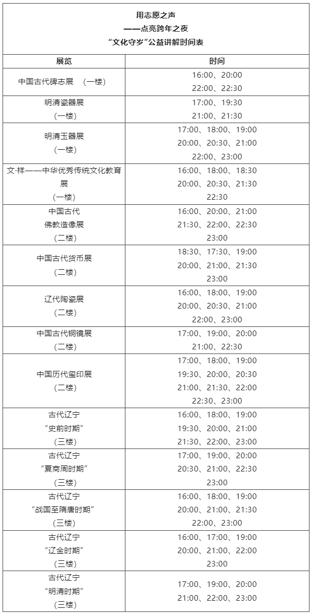 12月31日16:00—23:00(每逢整点/半点),辽博志愿者将在各主要展厅提供专业公益讲解,大家无需单独预约。