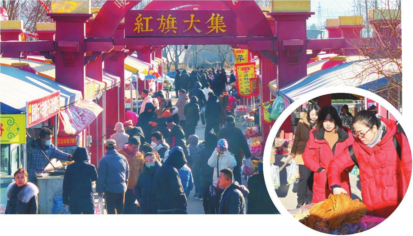 红旗大集有着300多年的历史,占地13万平方米,有商户3000余户,商品涵盖农副产品、生鲜水产、水果蔬菜、服装鞋帽、生活小百货以及独具区域特色的文创产品等,日常客流量约5万人次,节假日客流量达10万余人次。每逢节日,集上会有特色民俗和非遗项目展示,包括东北大鼓、面塑、吹糖人、皮影戏、剪纸、驴打滚等。不知不觉中,红旗大集已经成为营口市一张亮丽的文旅名片。