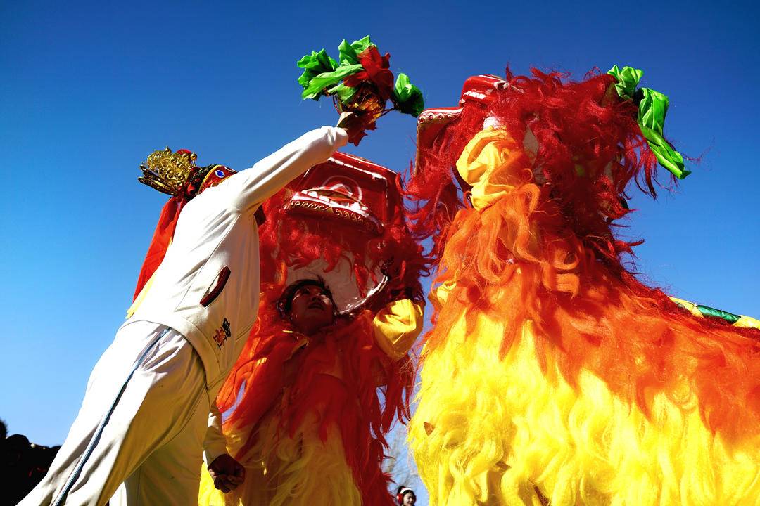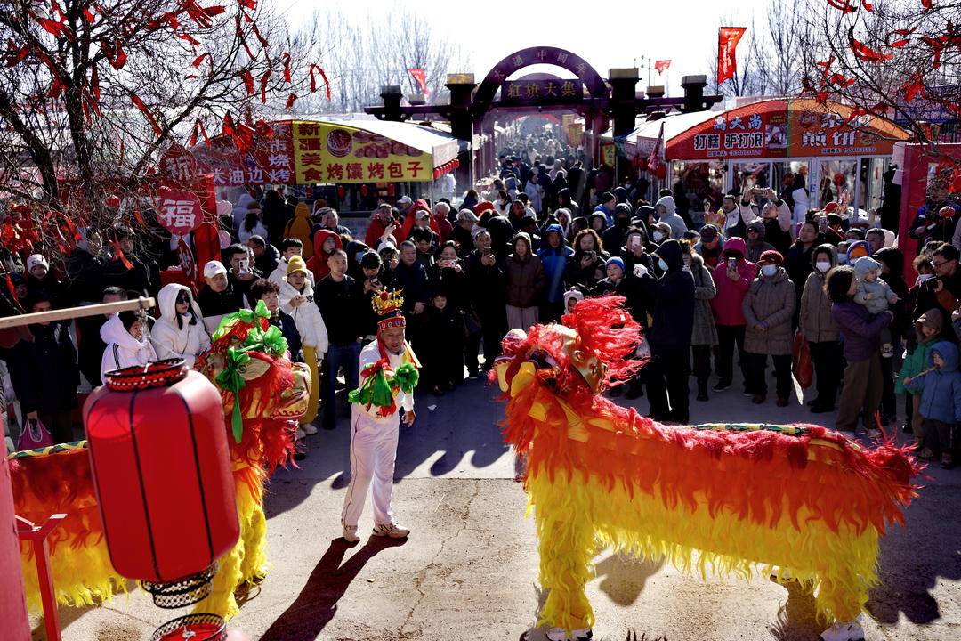 集市上人潮涌动,处处洋溢着喜庆氛围。舞狮表演轮番上演,红黄狮身跃动翻腾,鼓点铿锵间点燃现场热情;特色摊位前,现灌血肠、鲜肉串、糖画等美食飘香,摊主的吆喝声与顾客的欢笑声交织。