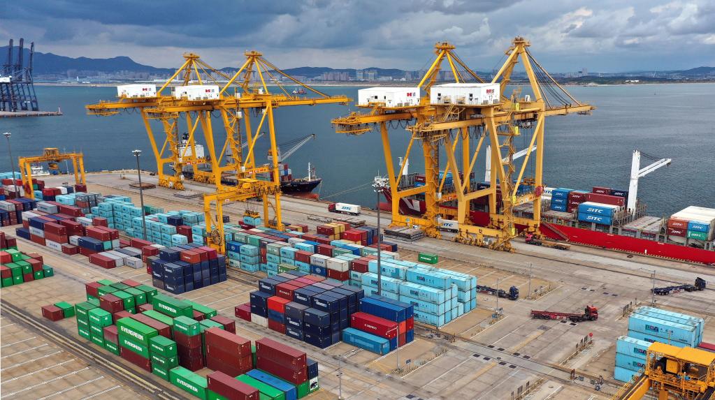 在辽宁省大连市辽宁港口集团大连港集装箱码头,货轮在装卸集装箱。新华社记者姚剑锋 摄