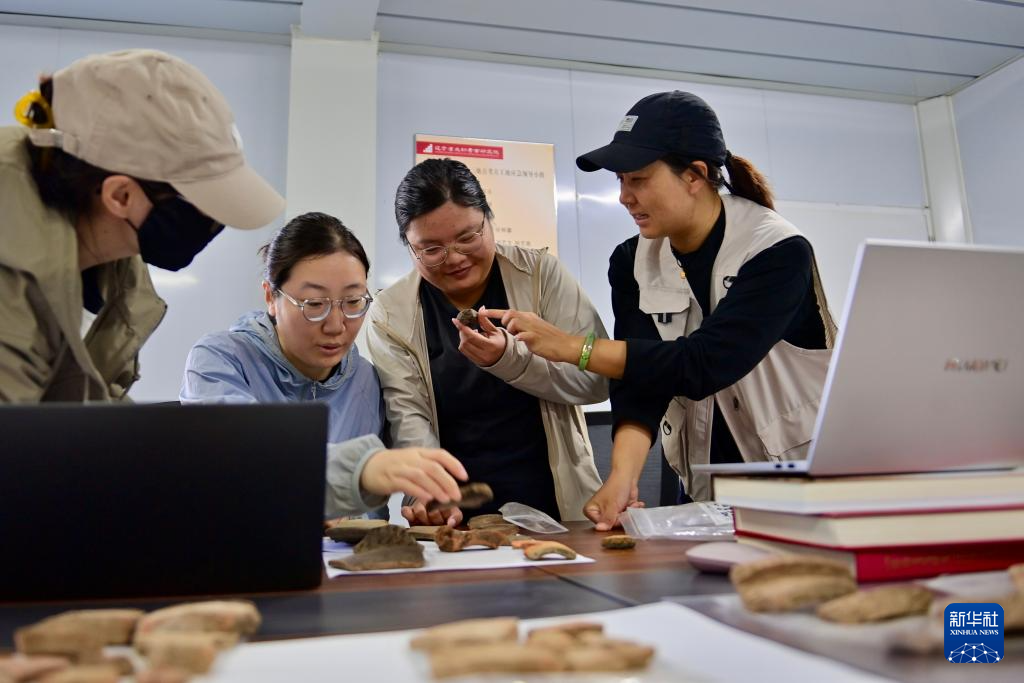 9月28日,于怀石(右一)和同事在位于辽宁朝阳的牛河梁工作站内辨别出土的文物。新华社记者吴青昊 摄