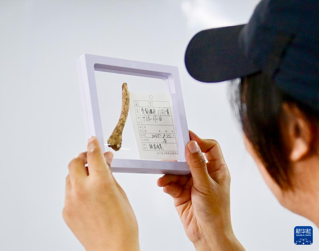 9月28日,于怀石在位于辽宁朝阳的牛河梁工作站内查看骨骸残件。新华社记者吴青昊 摄