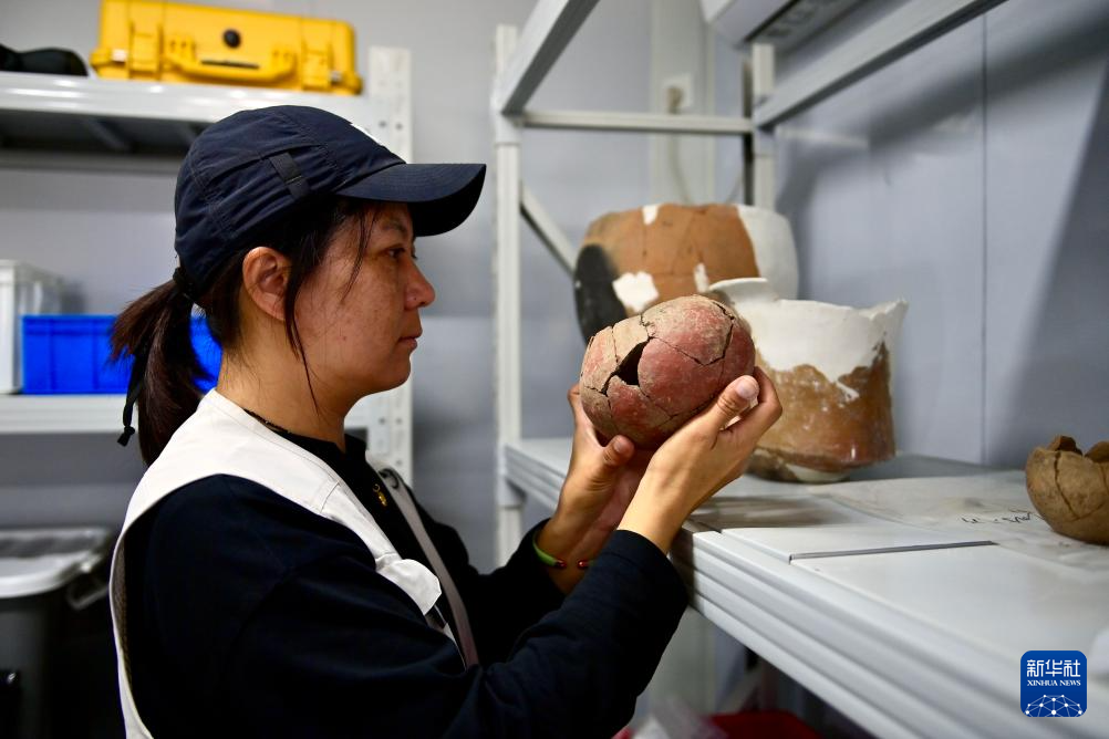 9月28日,于怀石在位于辽宁朝阳的牛河梁工作站内查看一件修复的陶罐。新华社记者吴青昊 摄