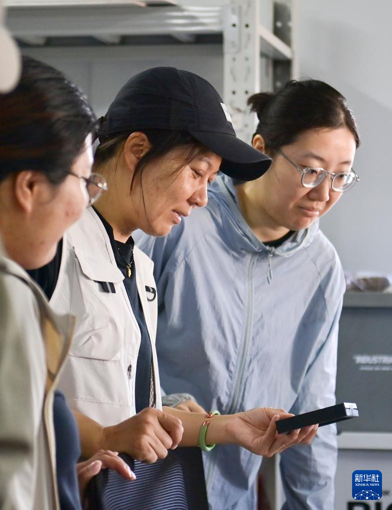 9月28日,于怀石(中)和同事在位于辽宁朝阳的牛河梁工作站内查看出土的文物。新华社记者吴青昊 摄