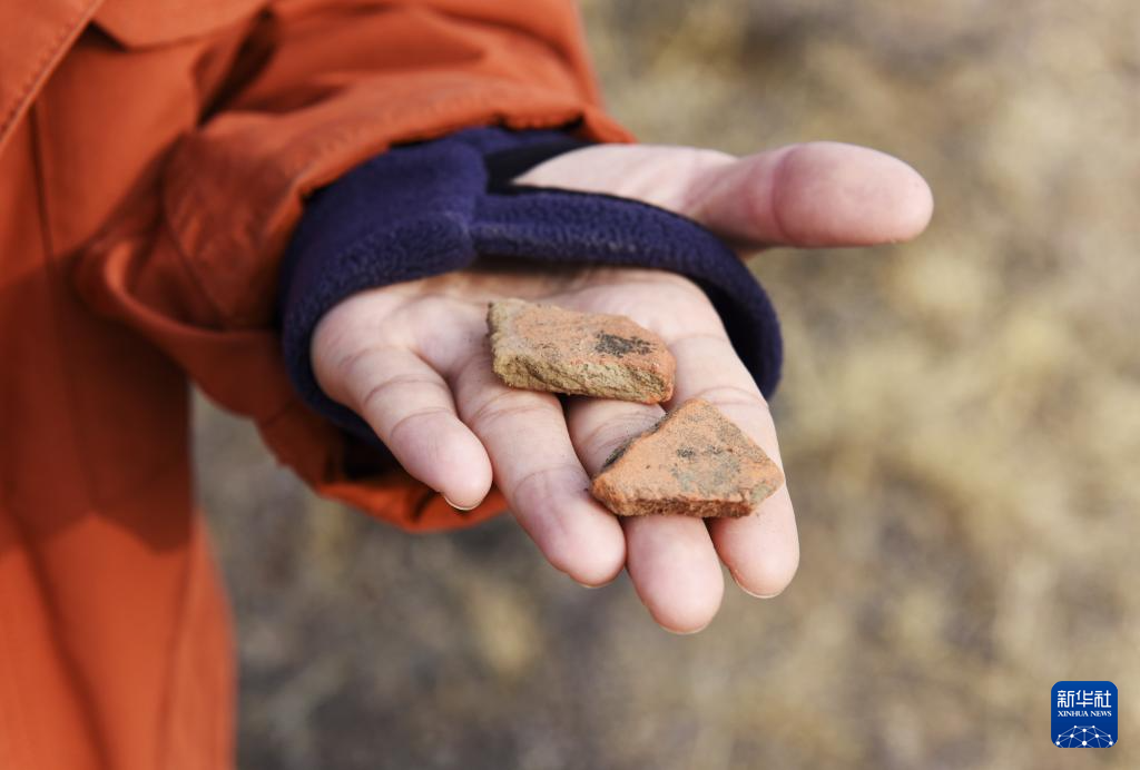 3月11日,在辽宁省朝阳市双塔区,于怀石展示在调查现场发现的碎陶片。新华社记者吴青昊 摄